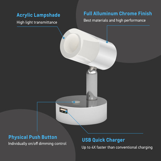 12V LED Reading Light, RV Bedside Swivel Wall Lamp Built-in High-Speed USB Charger, Frosted Acrylic Press Dimmer Switch