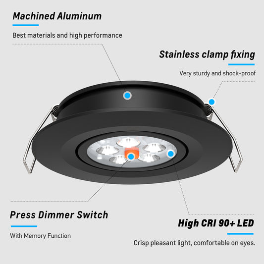 12V LED Puck Light, RV Boat Recessed Ceiling Light Under Cabinet with Press Dimmer, Dimmable White Light & Blue Nightlight, 3-1/4” Full Aluminum 4-Pack