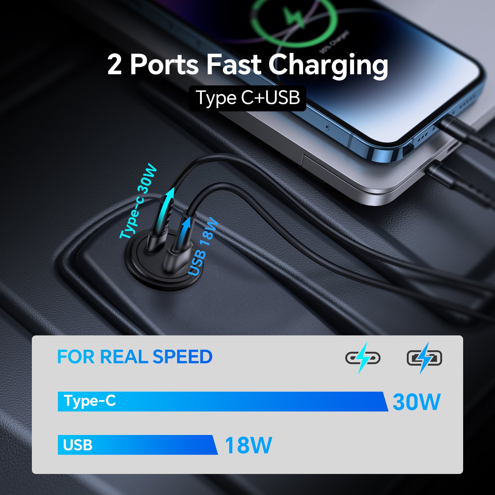 48W Dual Fast-Charging Ports: Equipped with a 30W USB-C PD3.0 port and 18W USB-A QC3.0 port, it charges two devices simultaneously at maximum speed while supporting 5V/9V/12V output voltages. Power up smart devices 40% faster than standard chargers, perfect for charging during road trips or camping breaks